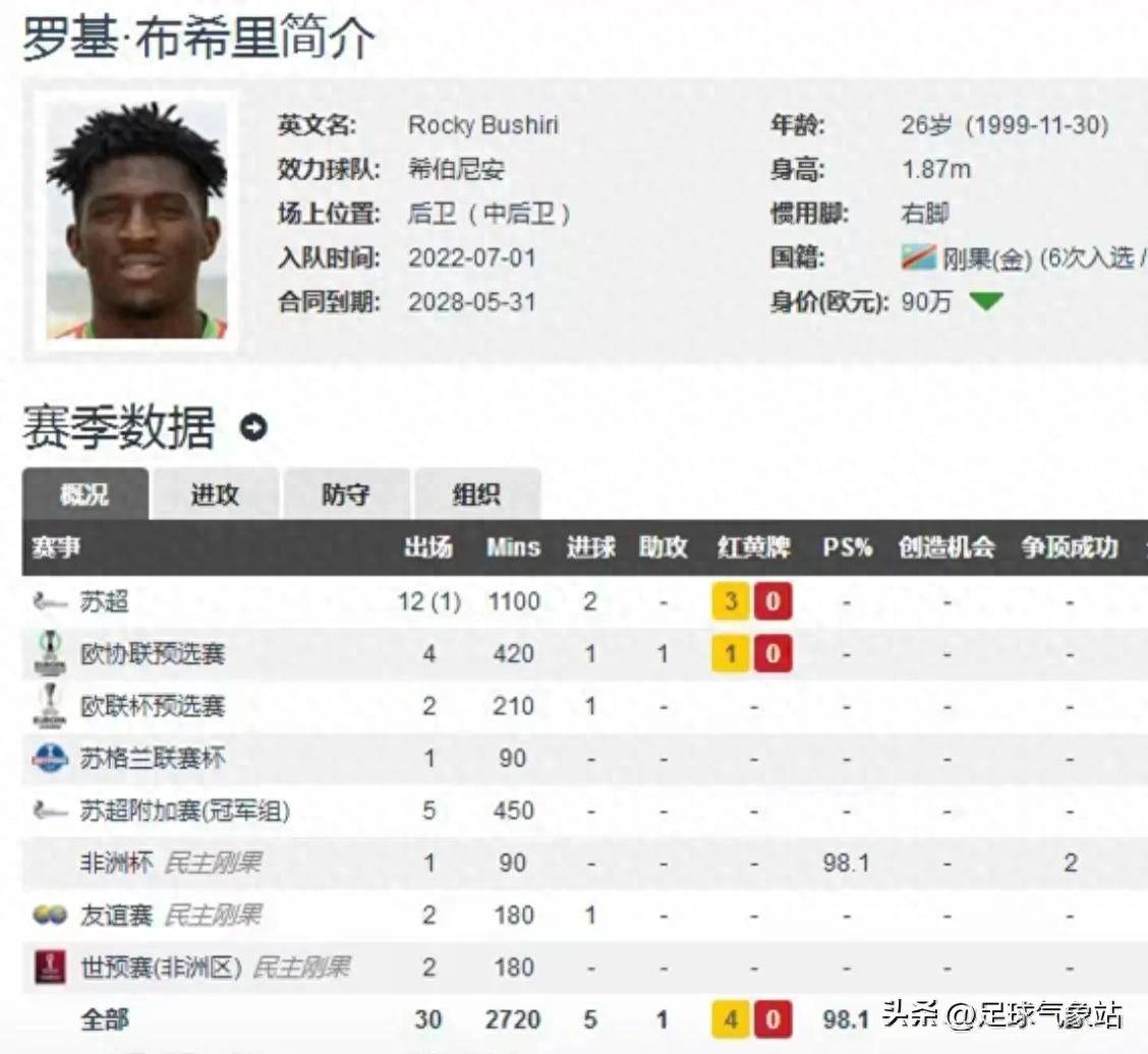 布希里现年26岁,身高1米87,体重91公斤,身价90万欧元,司职后卫。资料显示,布西里对抗能力出色,出球意识不错,能够上前参与进攻,但他也有自己的短板:速度一般,而且不擅长回追,容易失位。此前,他曾效力于欧本、布莱克浦、圣图尔登、梅赫伦等球队,但他效力时间最长的球队还是希伯尼安。自从2022年加盟以来,他代表希伯尼安已经出场了110次,直接打进8球,贡献了2次助攻。这个赛季他场均仅为4.38次,苏超13场进了2球。